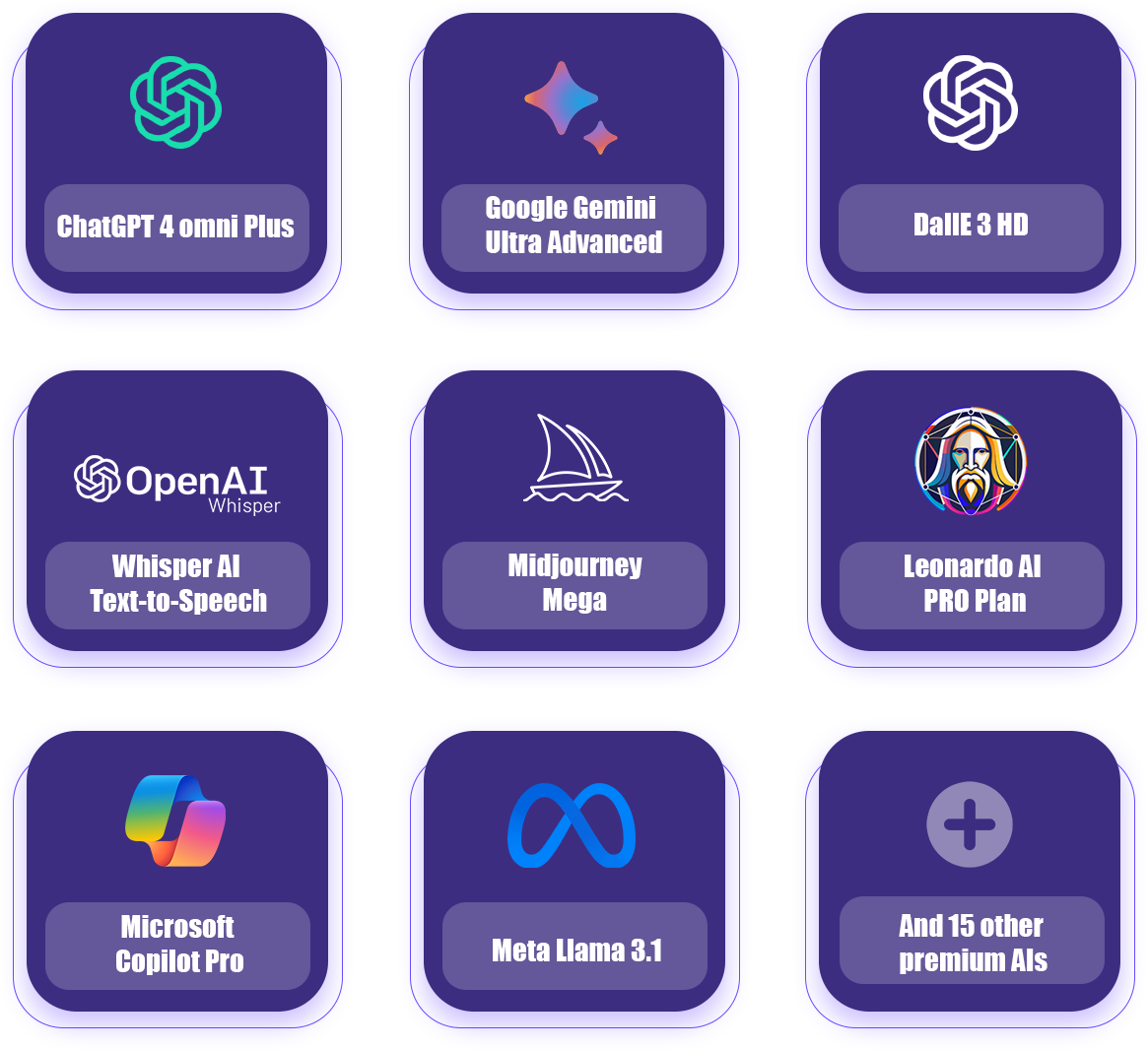 - ChatGPT 4o Plus, Google Gemini Ultra Advanced, DallE HD, Whisper AI Text-to-Speech, Midjourney Mega, Microsoft Copilot Pro, Leonardo AI Pro, Meta Llama 3.1 and 15 Other Premium AIs